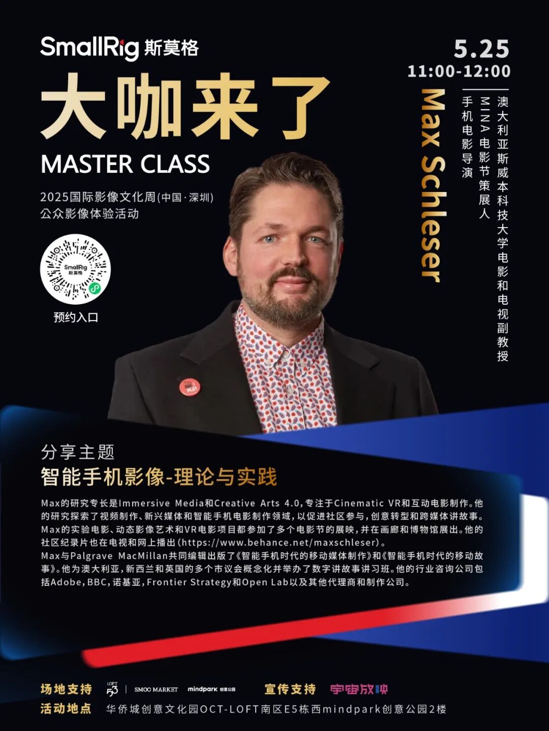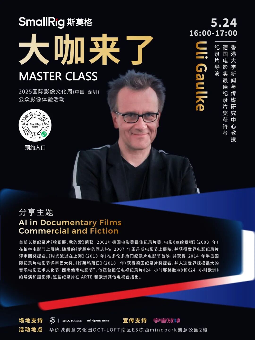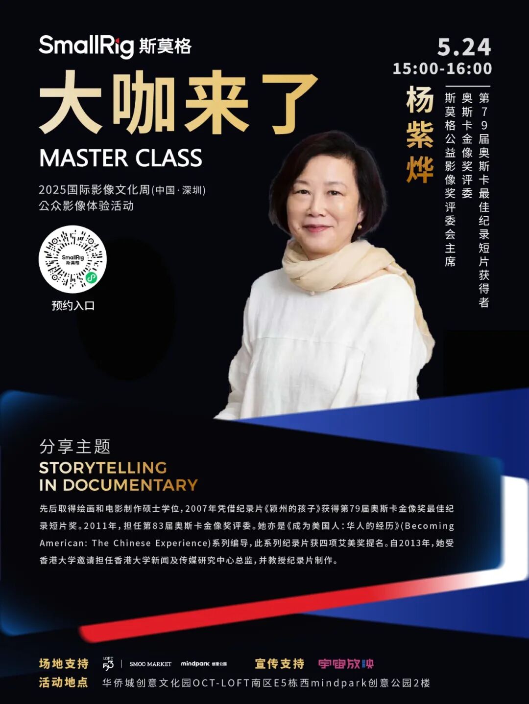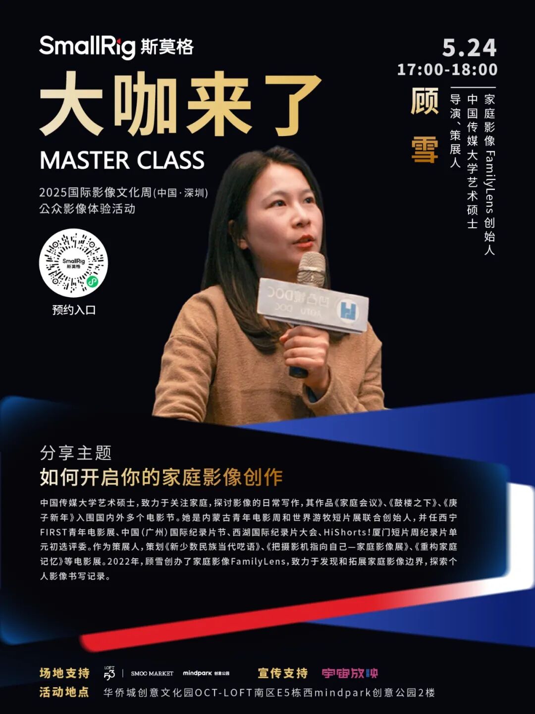 以“影像浪潮・时代进程”为主题的2025国际影像文化周(中国·深圳)于5月23日-25日举办。作为国际影像文化周的三大核心板块之一,5月24日至25日,公众影像体验活动《大咖来了》迎来多场重量级影像大咖分享活动。