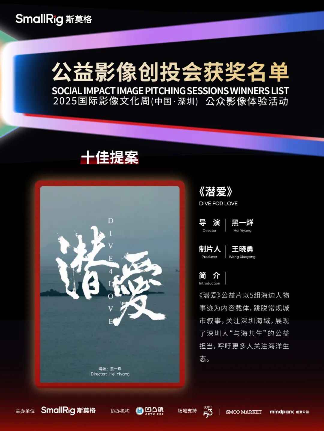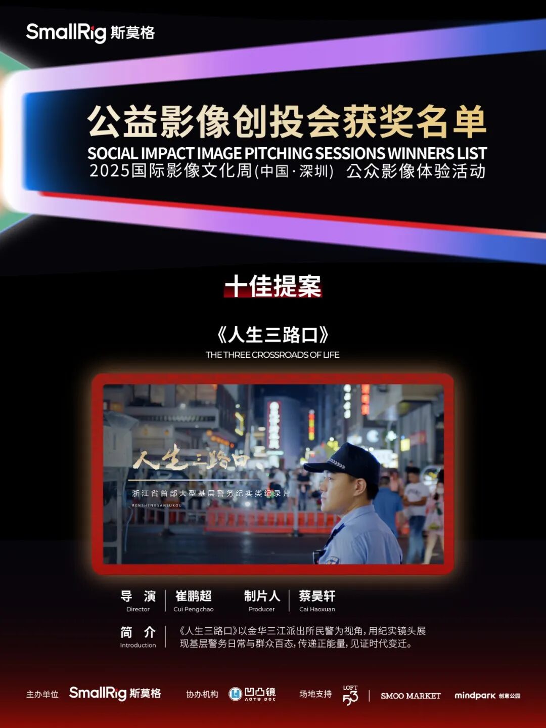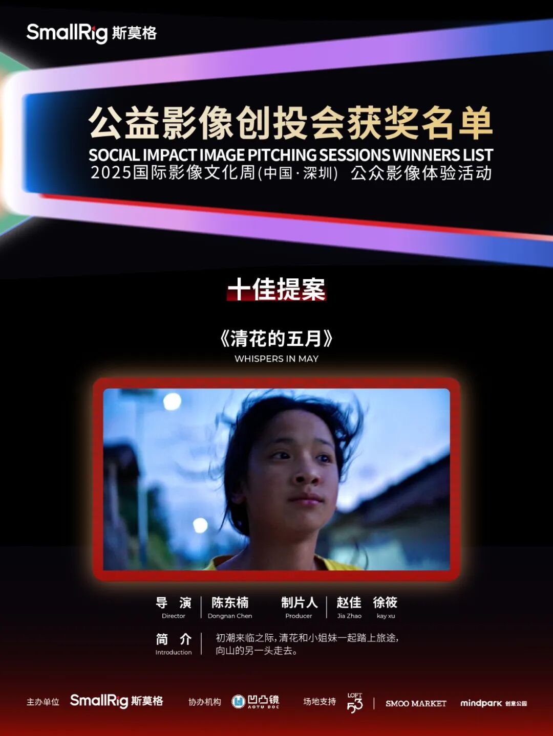 5月24日,作为2025国际影像文化周(中国·深圳)的重要内容之一,SmallRig公益影像创投会迎来线下路演环节。本届创投会共征集来自中国、美国、比利时等国家和地区的124部有效提案,涵盖纪录片、剧情片、实验影像等多种类型,聚焦生态保护、女性成长、残障融合、基层治理等多元社会议题。经过严格筛选,十部优秀作品脱颖而出,展开现场路演。