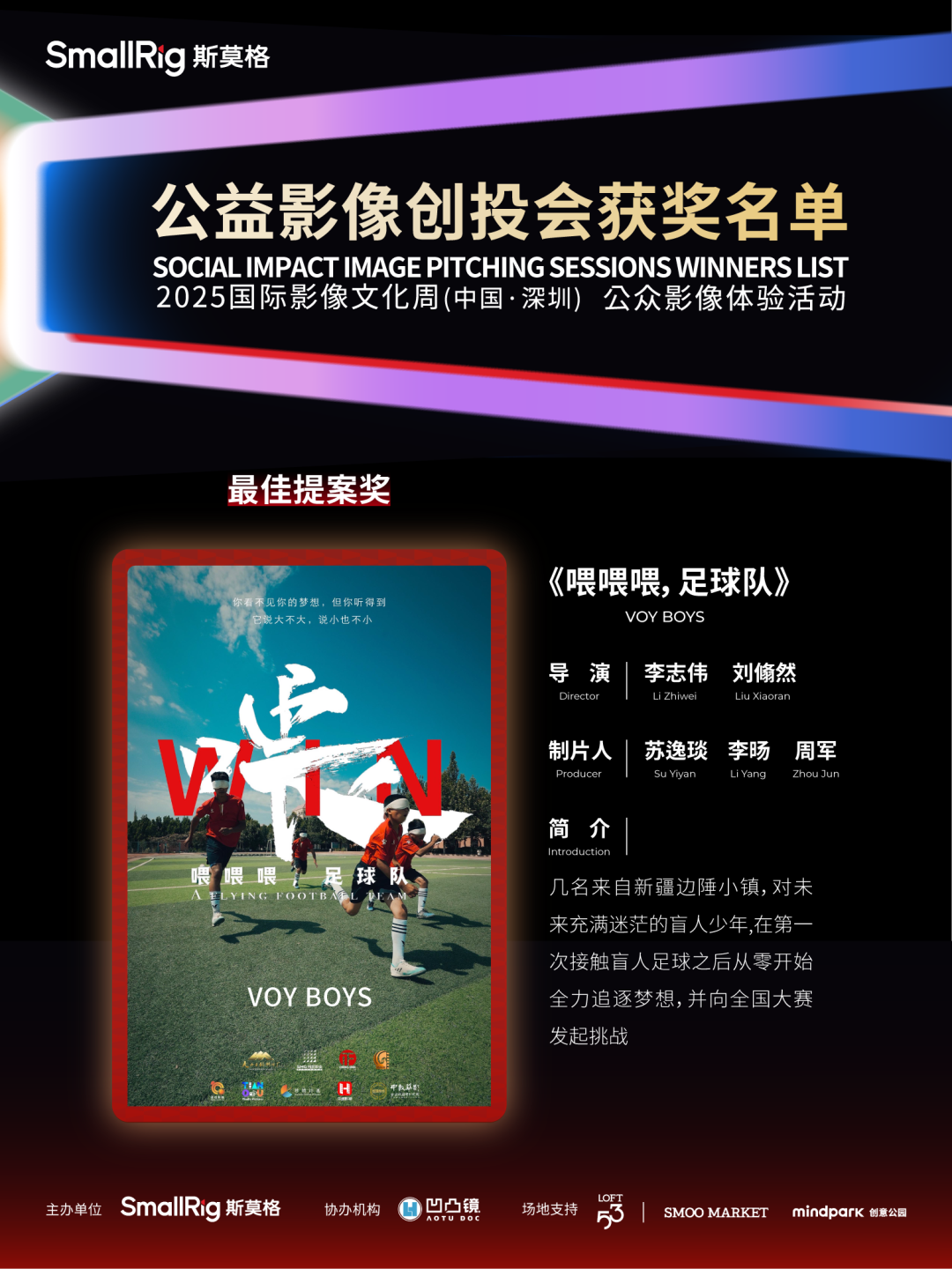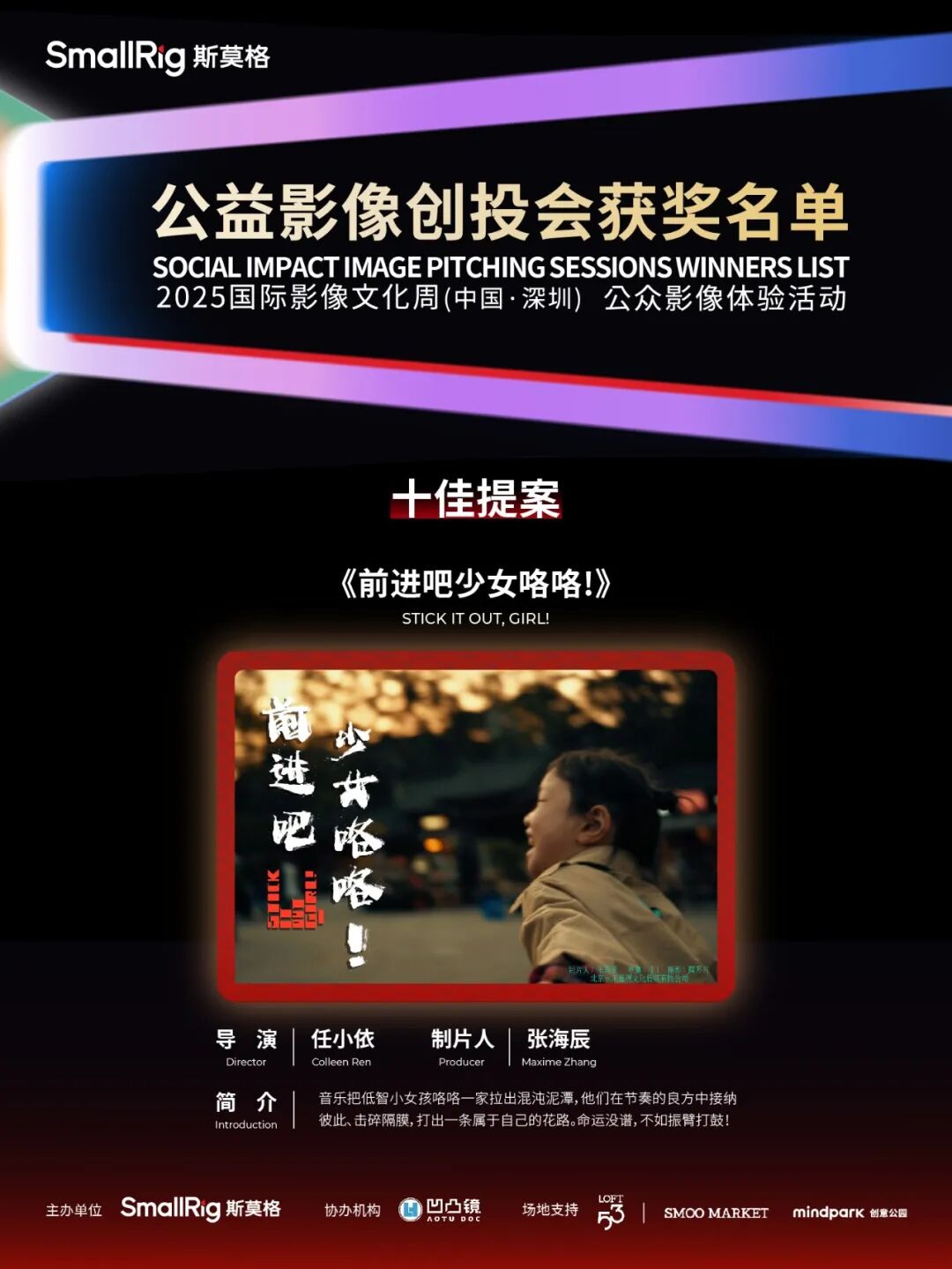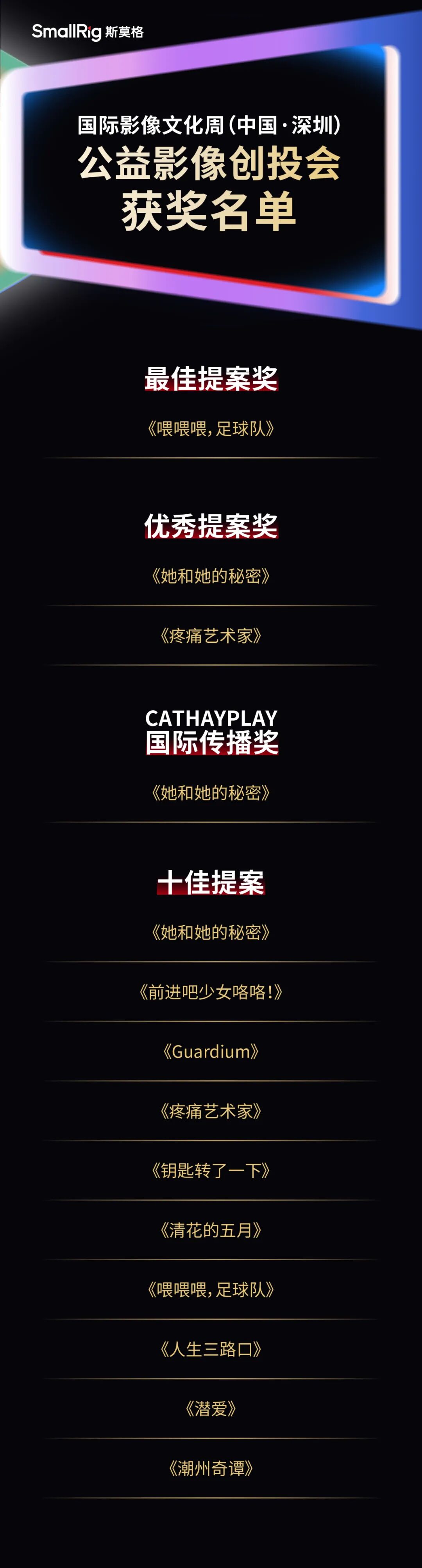 此外,《喂喂喂,足球队》斩获“最佳提案奖”,《她和她的秘密》《疼痛艺术家》分别获“优秀提案奖”,三个提案成为乐其SmallRig影像发展基金双100支持计划的入选项目,获得基金提供的项目资金。其中《喂喂喂,足球队》获得50000元,《她和她的秘密》《疼痛艺术家》各得20000元。