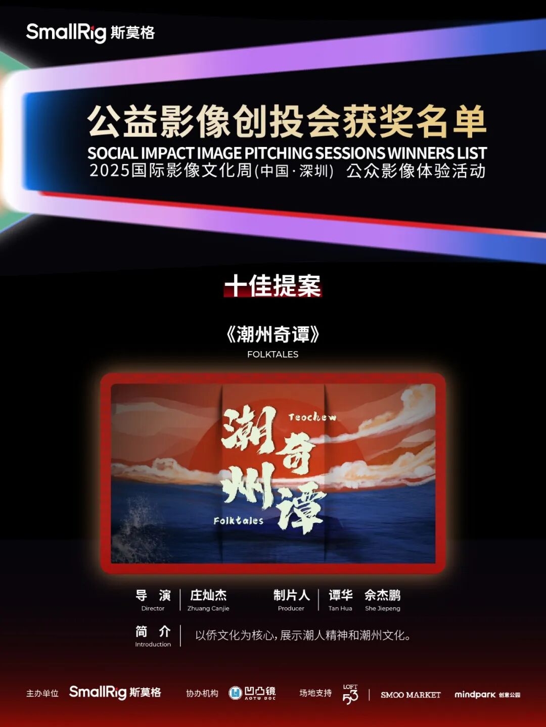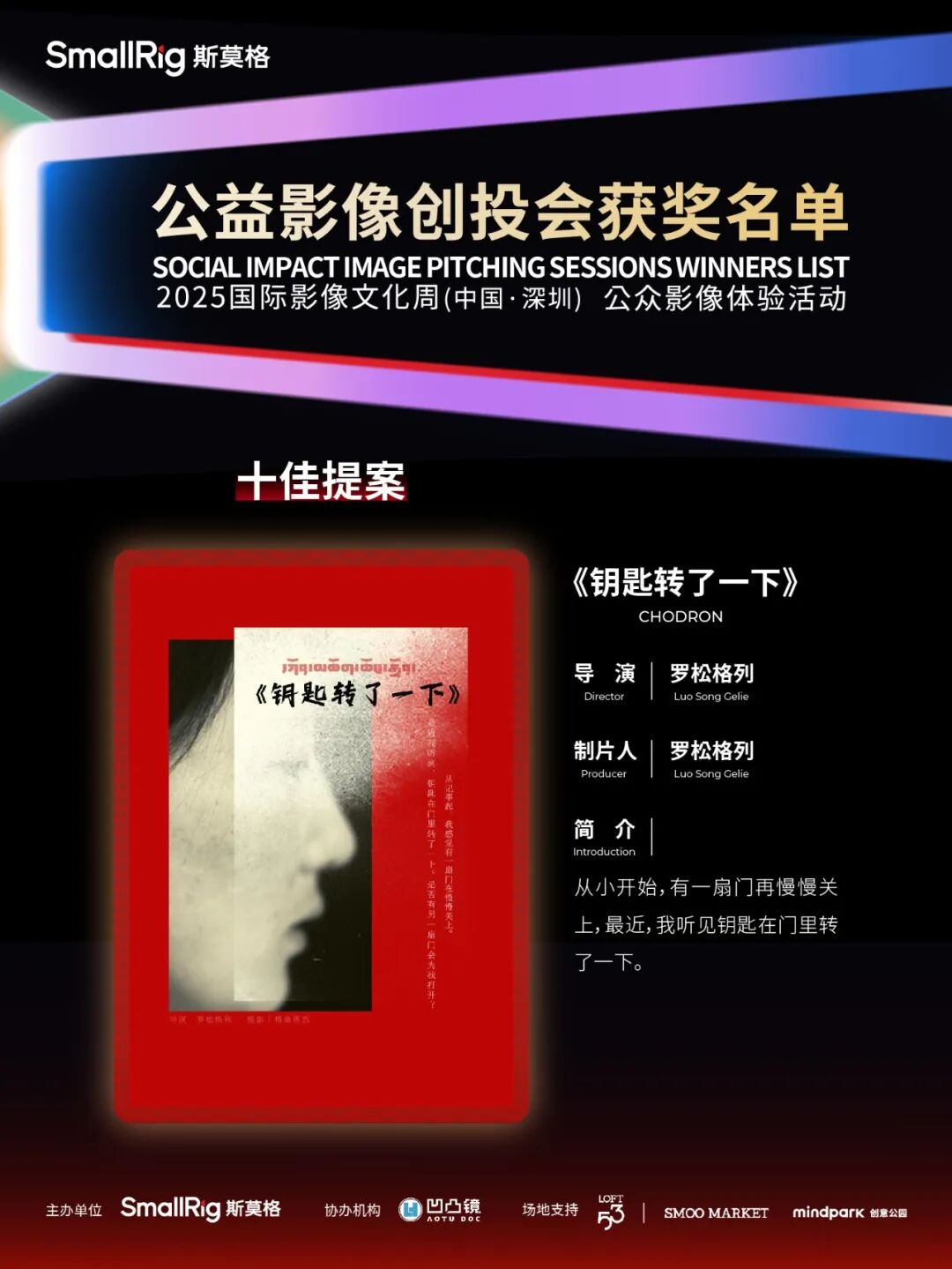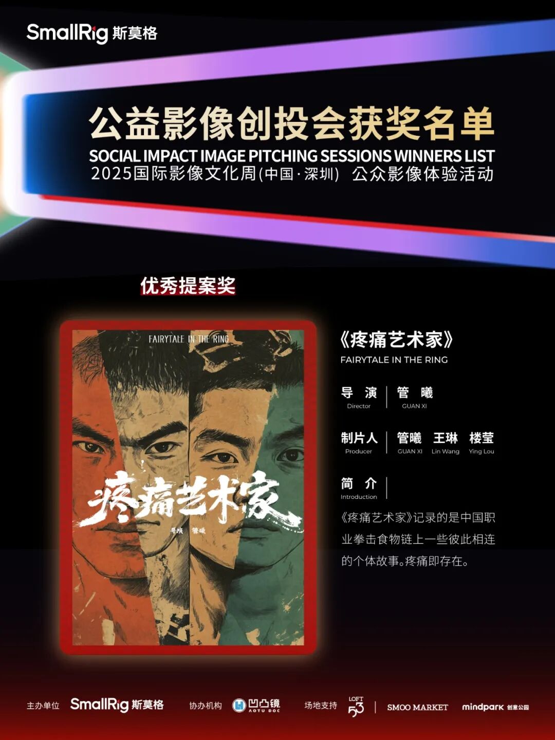 此外,《喂喂喂,足球队》斩获“最佳提案奖”,《她和她的秘密》《疼痛艺术家》分别获“优秀提案奖”,三个提案成为乐其SmallRig影像发展基金双100支持计划的入选项目,获得基金提供的项目资金。其中《喂喂喂,足球队》获得50000元,《她和她的秘密》《疼痛艺术家》各得20000元。