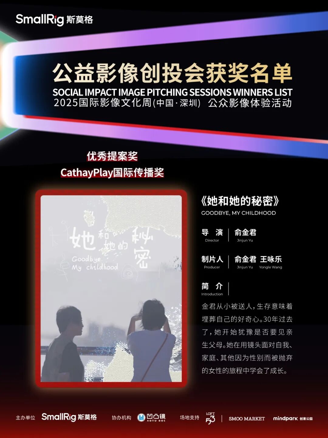 同时,本次公益影像创投会还得到了行业同仁的助力,知名华语独立电影流媒体平台CathayPlay.com在创投会设立了CathayPlay国际传播荣誉,《她和他的秘密》摘得该奖项并获得由CathayPlay提供的10000元项目资金支持。