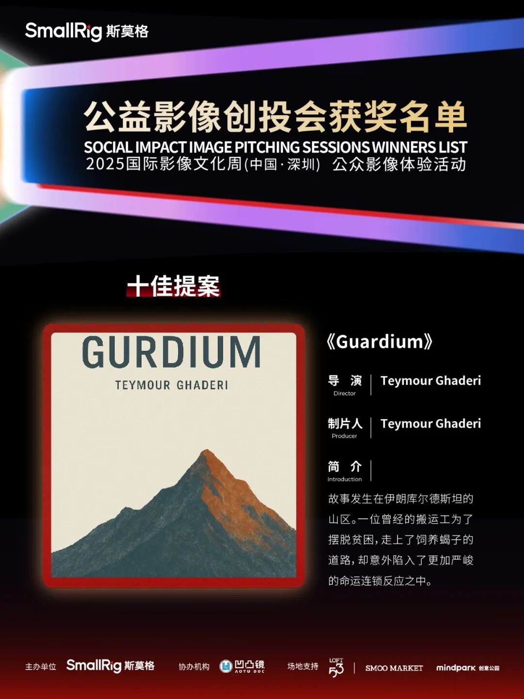 《Guardium》讲述了一个边境从事搬运工的男人为寻求稳定生活而开始养殖毒蝎并走私毒液,但却因错误抉择导致旁人死亡的宿命故事,边界关系是决策人们关注这部国际作品的切入点,Teymour Ghaderi也希望能够借此机会促成影片的跨国制作。